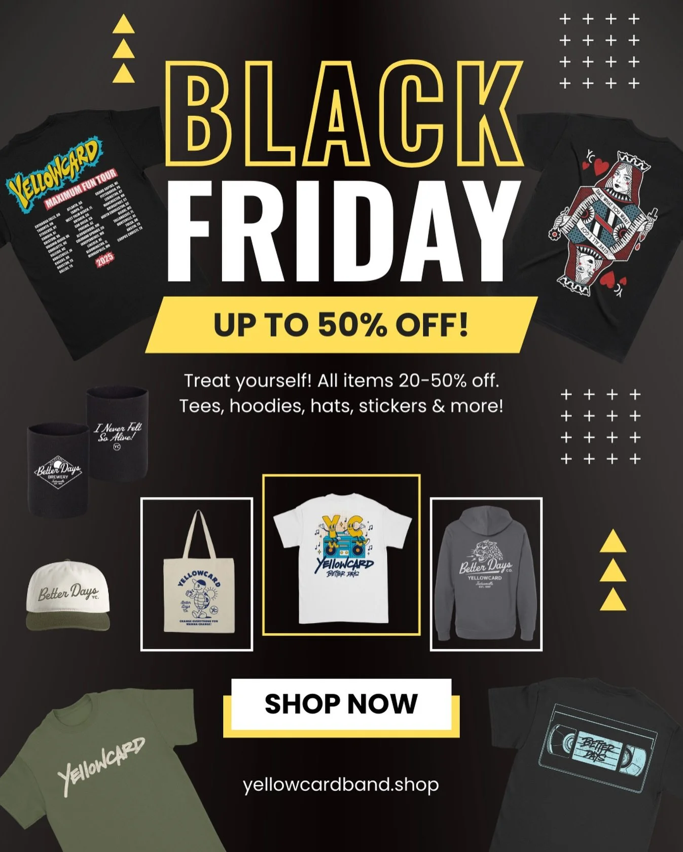 View fullsize Treat yourself! Everything in the store is between 20-50% off for Black Friday! Tees, hats, hoodies, stickers and more. Sale runs through 12/1. ➑️ yellowcardband.shop